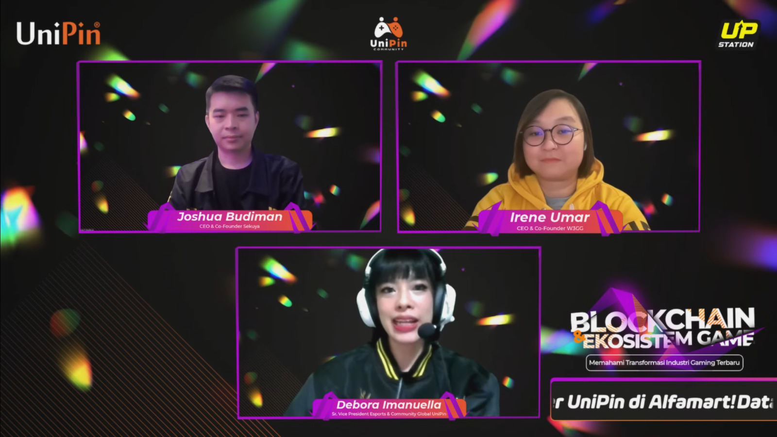 Gelaran webinar ini sekaligus menjadi wadah edukasi bagi para pelaku untuk melihat peluang pertumbuhan baru demi memastikan diri tetap relevan dan siap menghadapi masa depan; sebagai sebuah komitmen lainnya dari UniPin untuk mengedukasi komunitas dan memajukan industri. Membahas topik ini, hadir sebagai pembicara adalah Irene Umar selaku CEO & Co-founder W3GG dan Joshua Budiman selaku CEO & Co-founder Sekuya.