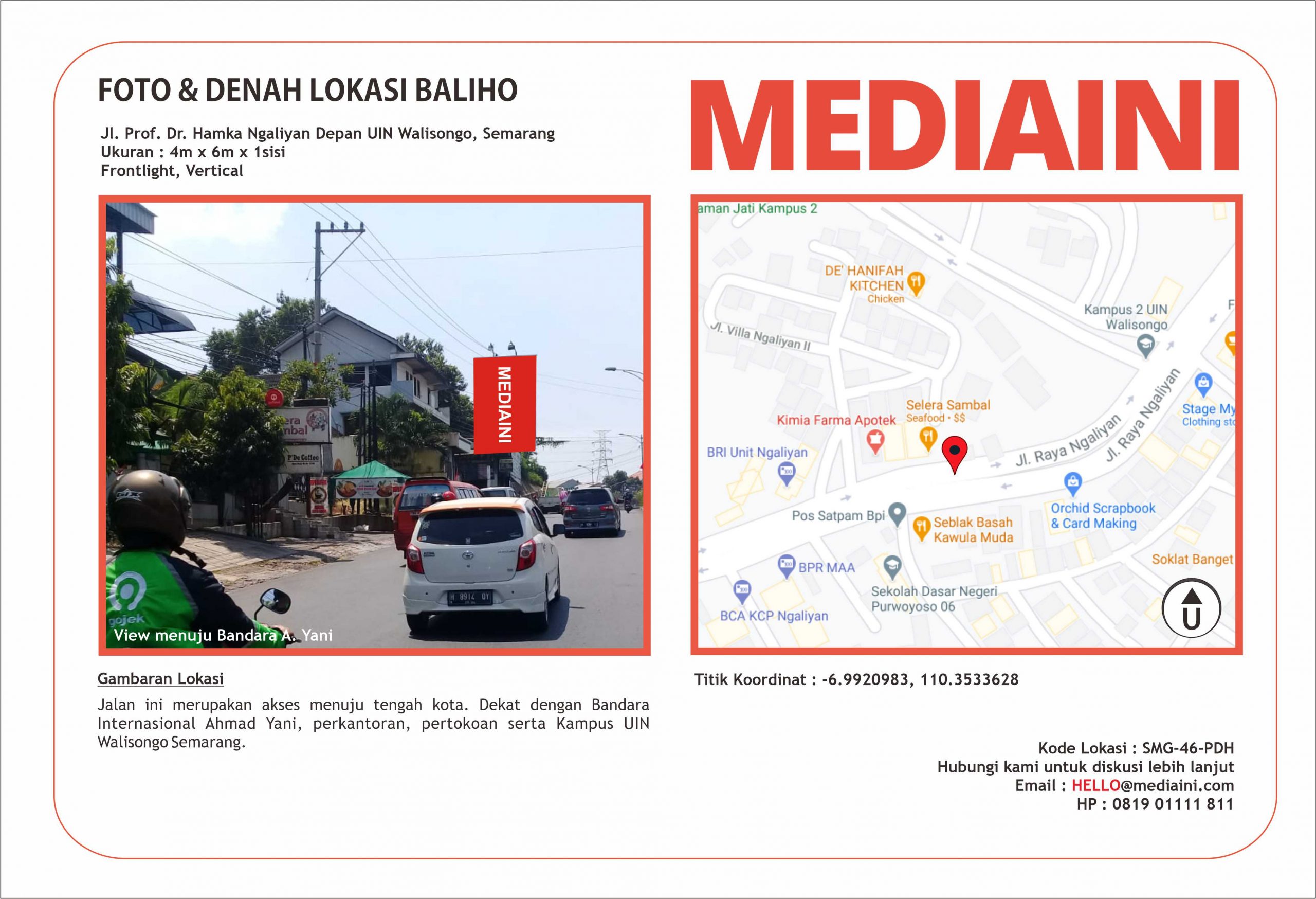 Sewa Baliho Jl Prof Dr Hamka Ngaliyan Semarang – Lokasi ini dekat dengan residence, UIN Walisongo, sekolah, tempat kuliner, perkantoran, dan bisnis lainnya. Selain itu, jalan ini memiliki traffic yang ramai karena merupakan akses menuju Kawasan Industri Candi di Semarang.